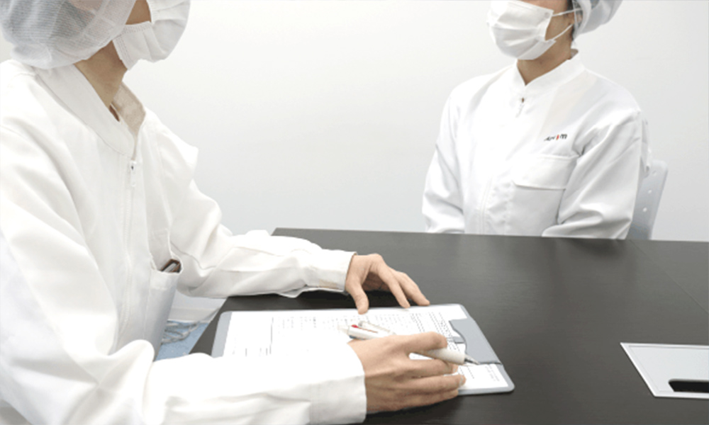 入社後はまず座学研修を行い、その後製造現場で作業トレーニングが始まります。教育担当者だけでなく事業所全体で新入社員をフォローする仕組み・風土があり、さらに研修中、労務責任者や所長との定期面談も実施。新人ならではの不安に職場が気づける体制を整えています。